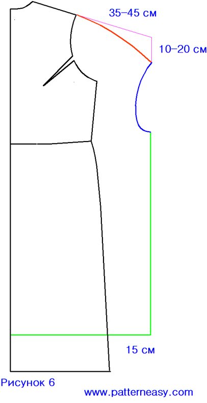 Теперь, удлиняем и опускаем плечо на такую же величину, как и на полочке (розовые линии), проводим новую линию плеча (красная линия). Делаем расширение 15 см по ширине, проводим перпендикулярно боковой срез (зеленые линии). И, в завершение, оформляем линию проймы (синяя линия) (рисунок 6).