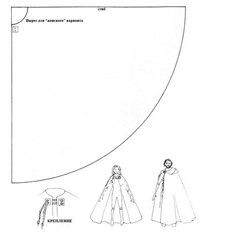 А вот выкройка для накидки с капюшоном, такую накидку можно использовать, например, для костюма Дракулы, капюшон пришиваем по линии горловины: