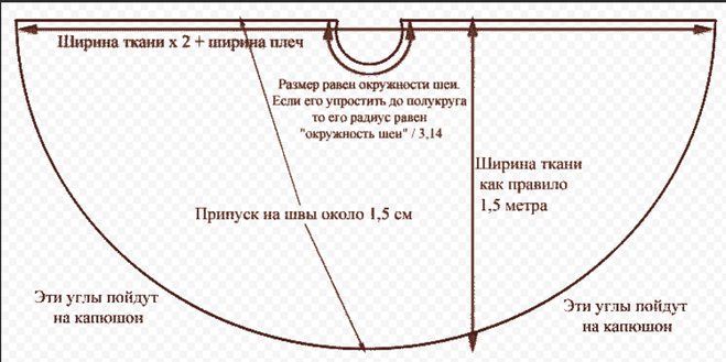 - Берем ткань, рисуем на ней окружность с радиусом, который будет ровняться длине будущего изделия. А диаметр второй окружности рисуется из той же точки, что и первый, но с добавлением 5 см для горловины. Вырезаем и разрезаем пополам переднюю сторону. Для создания капюшона вырезаем 2 квадрата со сторонами, равными 40 см, и закруглить на них по 2 угла.