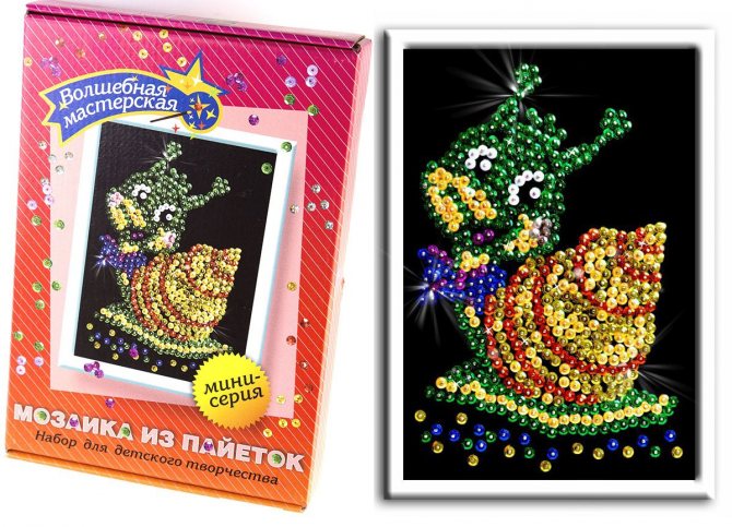 Для занятий с ребёнком можно воспользоваться готовыми наборами мозаик из пайеток. Такое увлечение помогает развить художественные способности малыша, зрительную память, мелкую моторику, усидчивость и внимательность. В таких наборах уже есть все необходимое: