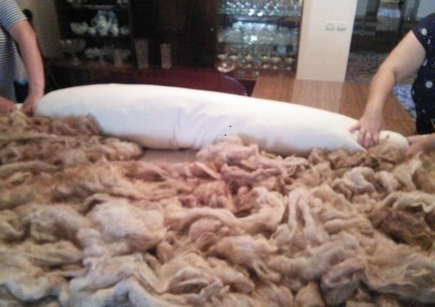 - Укладывание шерсти. На хорошо распрямленное одеяло нужно выложить шерстяные волокна. Их необходимо разровнять ладонями и позвать помощника, который станет с другой стороны и скатает одеяло в рулон. Сворачивать нужно не очень плотно и постоянно заталкивать пряжу, которая свисает по краям. Необходимо вместе взяться за незашитый край и натянуть на рулон. Затем расправить бока и вывернуть чехол в обратную сторону. Шерсть должна оказаться внутри, после чего её хорошо разглаживают руками. Расшитый край чехла аккуратно зашивают.