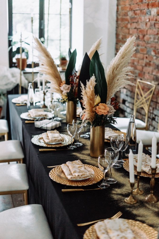 Основными цветами свадьбы были выбраны черный, золотой, неон, в декоре присутствовала пампасная трава. В наши образы хотелось добавить немного рок-н-ролла и легкости — как и во всей свадьбе. Примерив больше 20 платьев, выбрали самое-самое, то, которое удачно гармонировало с татушками. Свободный стиль также присутствовал в образе ведущего Павла Артемова, образ которого совпадал со стилем Хантера Томпсона, популярного журналиста и героя фильма «Страх и ненависть в Лас-Вегасе».