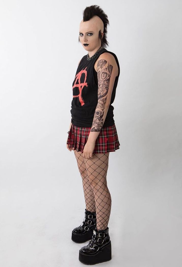 Обязательными элементами выступают гриндерсы (ботинки по типу армейских, которые часто можно увидеть на Аврил Лавин), черная сетка на колготках, кожаная байкерская куртка и легинсы в неоновых расцветках.
