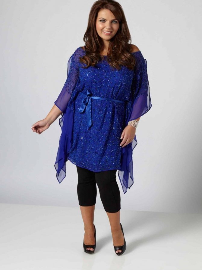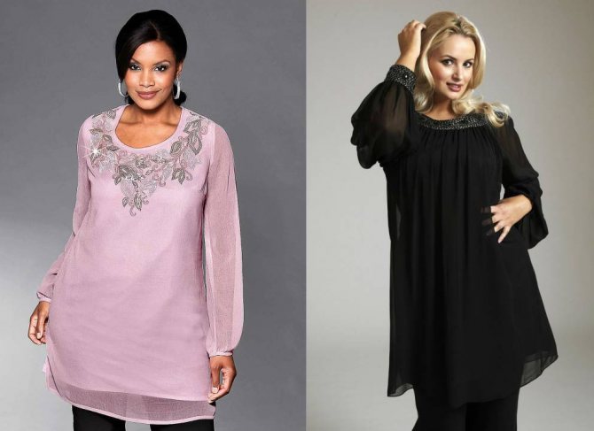 Большой популярностью пользуются нарядные туники для полных женщин. Их могут украшать кружева, оборки и яркие стразы. При пошиве используются блестящие и принтованные ткани.
