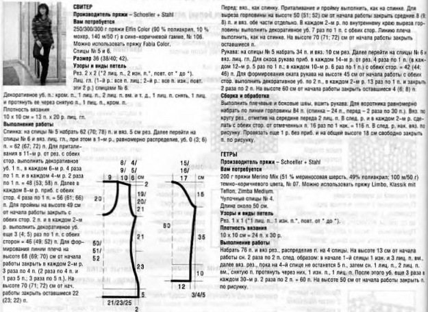 Резинка свитера вяжется спицами №4, осн.узор сп.№4,5. После провязывания резинки надо сделать равномерно 25 убавок в одном ряду. Все остальн.убавки указаны на схеме. Передняя часть вяжется как спина до 36 см, а потом надо перейди на вязание по схеме№2.
