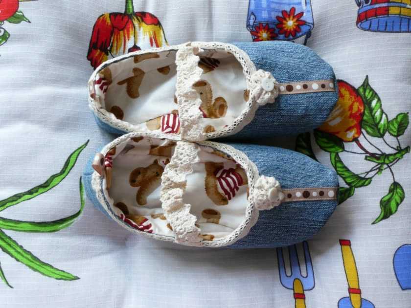 Завершающим этапом будет соединение деталей. Нужно сначала скрепить подошву и верх изделий булавками, прострочить места соединения и сделать отделку кромки.