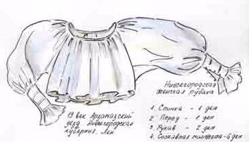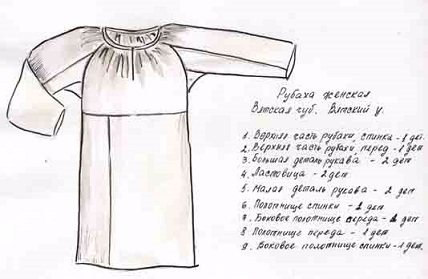 Основу костюма составляет длинная рубаха, являющаяся архаичным видом как женской, так и мужской одежды. Вятская рубаха составная, прямого покроя. Ее верх — «воротуха» — изготовлен из тонкой отбеленной льняной ткани шириной 35 см.. Передняя и задняя части сшиты из полутора прямых полотнищ, соединенных вверху рукавами. Крой рукава особый, древний, получивший название » по топорному» (5). Рукав состоит из одного скошенного к запястью полотнища, имеющего в верхней части прямоугольный выступ, и одного клиновидного куска ткани меньшей длины с разрезом для вшивания ластовицы. Оно расширяет нагрудную часть и позволяет руке свободно двигаться. Верхние края передних и задних полотнищ и рукавов присборены под неширокую обшивку, образуя округлый вырез горловины с разрезом посреди груди и застежкой металлическим крючком. Нижняя часть рубахи — станина сшита из прямых и одного скошенного полотнища из льняных нитей более грубой выделки.