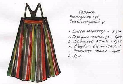 Сарафан сшит в виде высокой юбки (рис. 1.30) из семи прямых полотнищ темно-синей ткани. Два передних полотнища на 10 см длиннее задних, с которыми они соединяются треугольными боковыми вставками. В верхней части, на спине и груди, полотнища собраны под узкую обшивку и мелкие защипы (на спине — встречные), зафиксированные по лицевой стороне красной шерстяной нитью. Посередине груди имеется небольшой разрез, застегивающийся на пуговицу. Длинные узкие лямки крепятся на груди и середине спины. По низу сарафан украшен крупным орнаментом, выполненным в технике аппликации из красного узорного ситца: цепочку ромбов с обеих сторон обрамляют неширокие горизонтальные полосы. В верхней части сарафана края отмечены красной ситцевой бейкой.