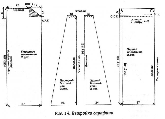 Самый древняя его модель — глухой сарафан в виде туники — изготавливался из одного загнутого пополам куска материала, образующего обе части изделия. С боков были широкие клинья.
