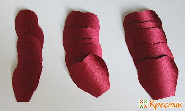 Выкраиваем нужное количество лепестков – 6 шт. Чтобы ускорить процесс, можно складывать ленту в четыре слоя (больше не рекомендуется, иначе получим неровные края деталей). Обратите внимание, что верхний кант ленты мы срезаем, а нижний оставляем для удобства выполнения сборки.