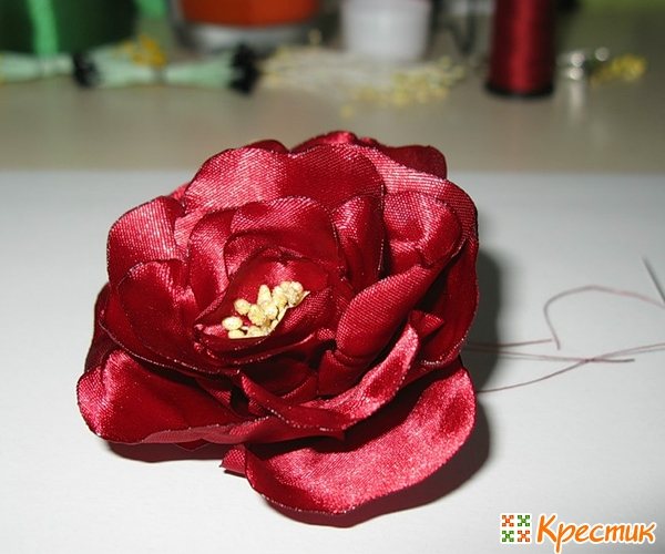 - Маленьким стежком добавляют тычинку в центре, прошивая тесёмочный шов сквозь красную ленту.