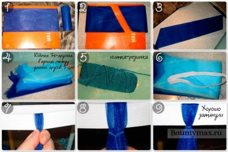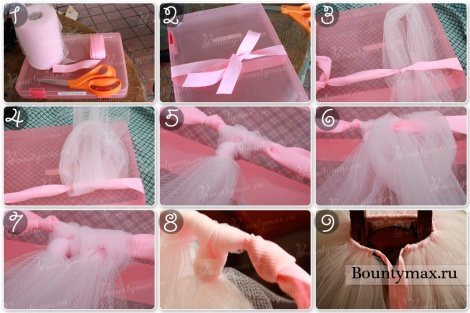 Итак, первый вариант юбки с основой в качестве ленты. В данном случае получится юбка-фартук. Нарезаем фатин полосами, их длина должна соответствовать желаемой длине юбки умноженной на 2. Далее складываем полоску вдвое и обвязываем ленту как показано на фото в пунктах №7-9.