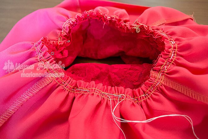 Чтобы собрать ровную сборку, аккуратно потяните за обе нижние нитки (нитки челнока), чтобы они не лопнули. Соберите и распределите равномерно сборку равную окружности кокетки. Концы ниток завяжите в узелки, лишнее отрежьте. Выполните тоже самое на подкладке.
