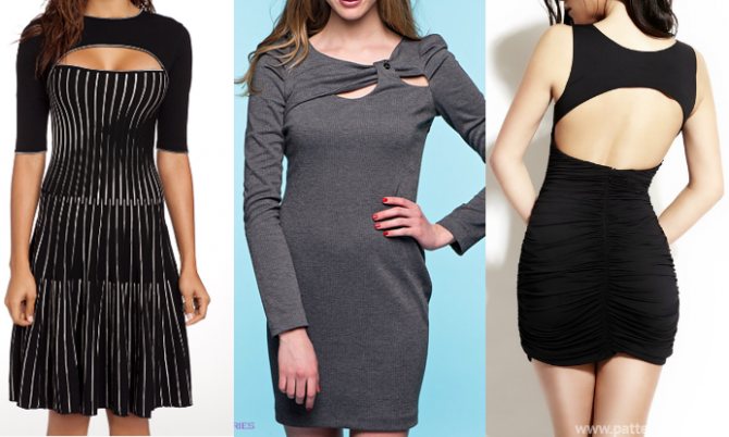 Очень неожиданный и смелый фасон создает кокетка с вырезом. Такой вырез всегда можно интересно обыграть. Например, дополнить его хлястиком застежкой (как на сером платье). Или сделать такую кокетку с вырезом на спине. Или заполнить отверстие выреза тонким прозрачным кружевом, подшив его к изнаночной стороне по краям кокетки и подола.