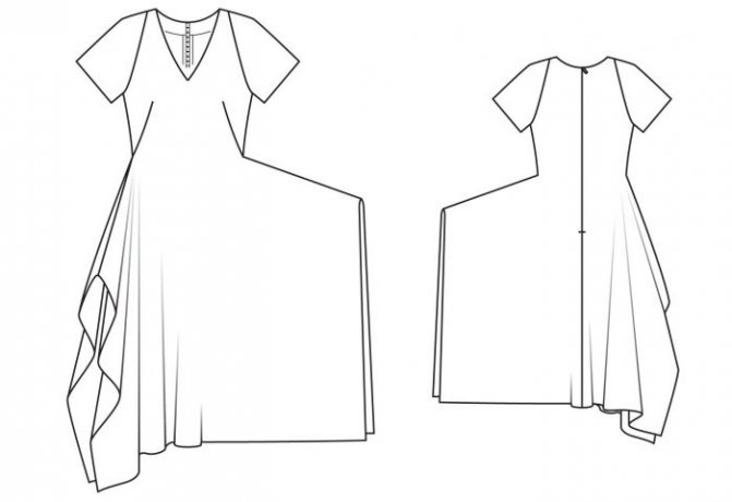 Для пошива данного изделия вам потребуется выкроить, помимо основных деталей, широкую оборку, которая образует спереди видимость подола. Используя в качестве основы приведенный чертеж, внесите в него коррективы по вашим размерам.