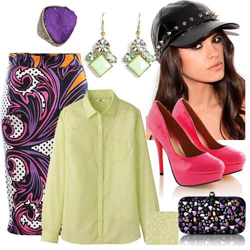 Женская летняя бейсболка черного цвета, декорированная шипами, дополнит рубашку, юбку с орнаментом, облегающего покроя, длиной до колен и туфли розовой расцветки на высоком каблуке.