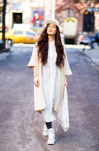 Женская бейсболка с прямым козырьком белого цвета составит гармоничный ансамбль с платьем свободного фасона, длиной макси, удлиненным кардиганом бежевого оттенка, сумкой и кроссовками белой расцветки.
