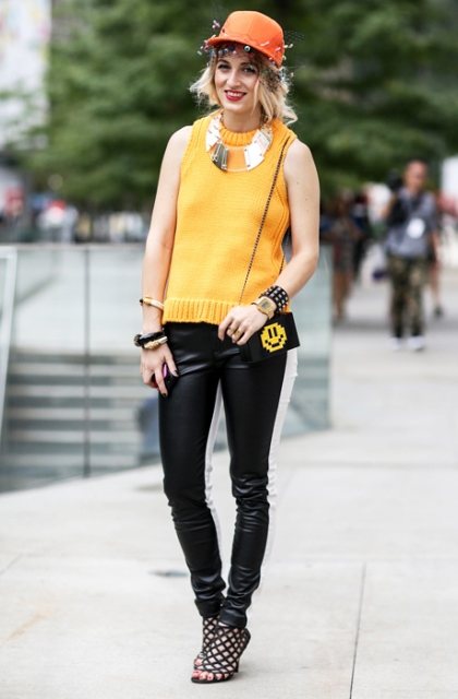 Женская кепка оранжевого цвета с прямым козырьком гармонирует с вязаной кофтой без рукавов, кожаными брюками черного тона, маленькой сумкой и босоножками черной расцветки на высоком каблуке.
