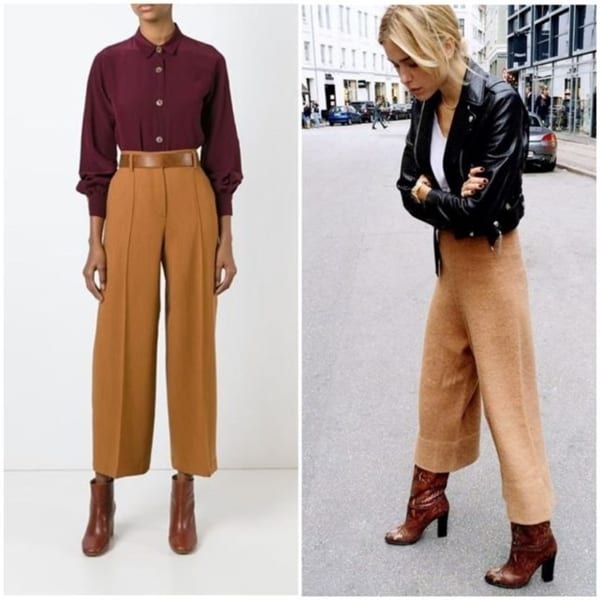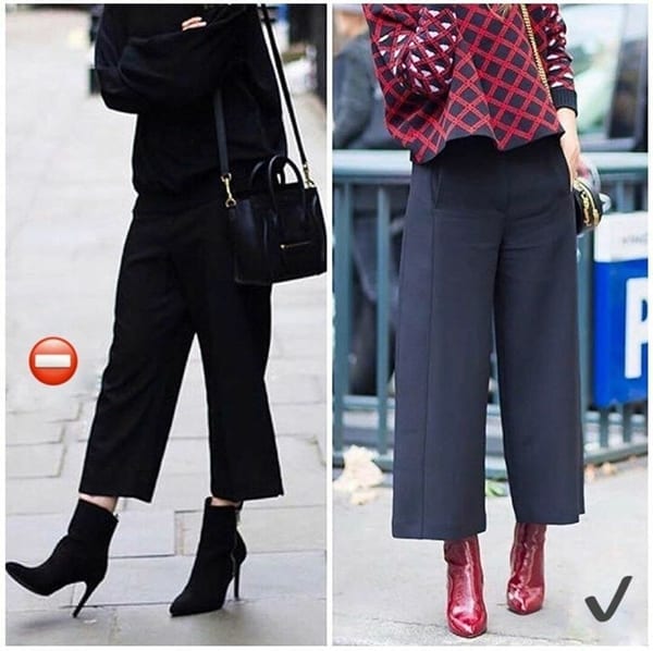 Некоторые девушки в восторге от стильного кроя кюлотов, но их растаивает их свойство визуально укорачивать длину ног. Нивелировать нежелательный эффект поможет завышенная посадка. Акцетный пояс и укороченный верх позволят вам усилить выбранное действие. В качестве обуви удачно смотрятся все те же сапоги.