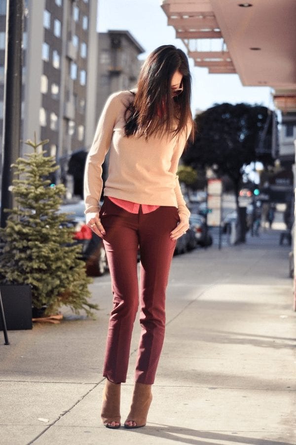 В случае с непарными брюками наверх можно надеть рубашку мужского кроя (заправляется внутрь), водолазку с укороченным жакетом, свитер с длинным кардиганом. Леггинсы требуют любого объёмного верха.