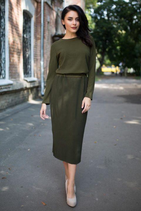 Элегантным решением будет под юбку хаки надеть блузу в цвет самой юбки. Чтобы разбавить цвета, вы можете надеть бежевые туфли и взять с собой сумочку в цвет.